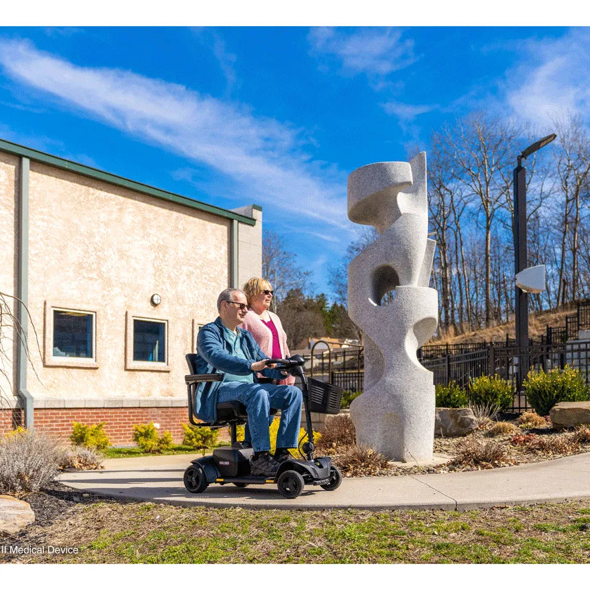 The Go Go Elite Traveller 2 4-wheel scooter offers easy disassembly and a lightweight frame. It has four wheel stability with three wheel maneuverability thanks to the iTurn Technology making the turning radius only 37" making it versatile and easy to handle. The heaviest piece weighs only 35 lbs for easy portability. The Go Go Elite Traveller 2 has an easy access knob to make adjustments to the Delta tiller and features an additional charging port. Interchangeable cardinal red or black panels and 12 AH batteries travel up to 8.8 miles in a single charge are standard.