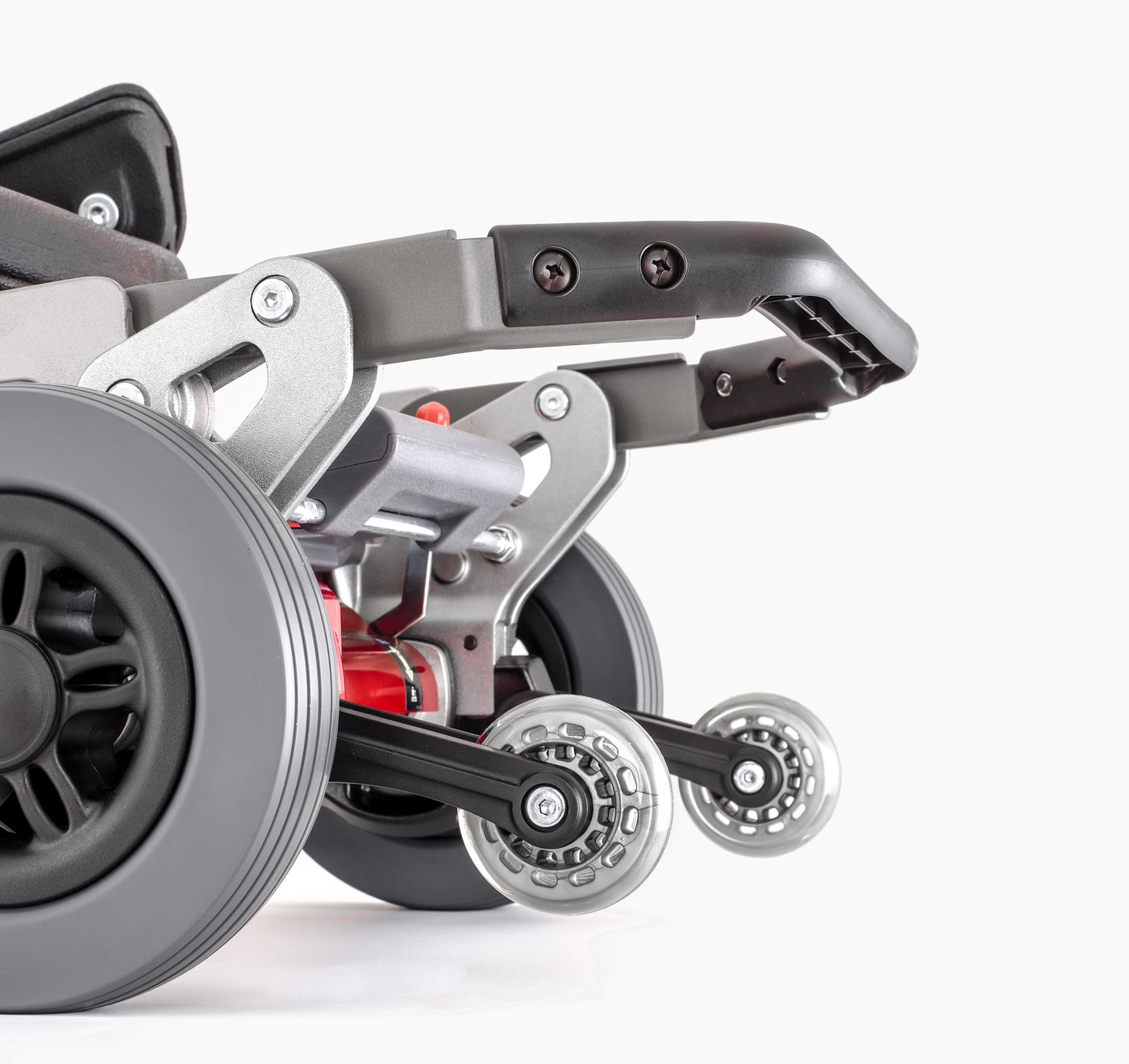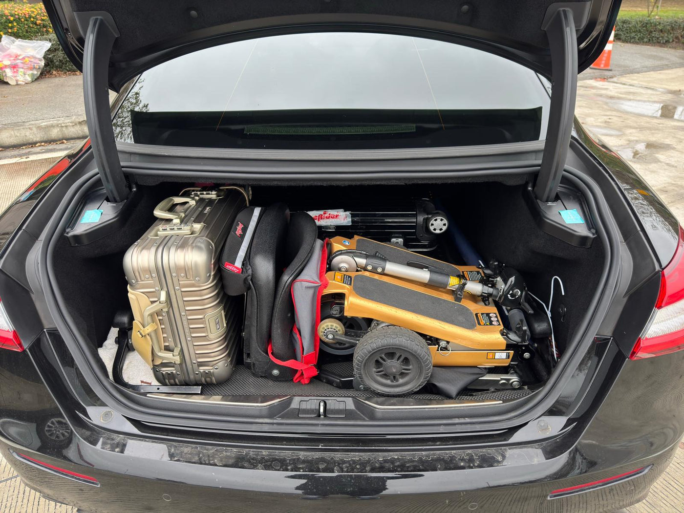 - Folded scooter conveniently rolls along like a travel suitcase