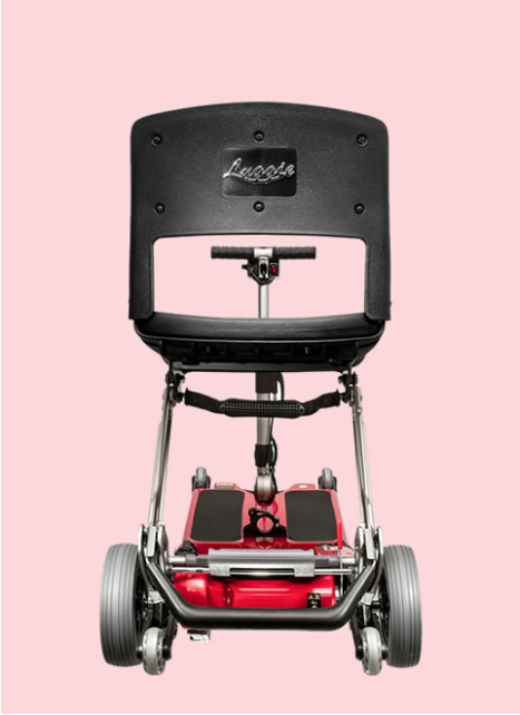 NOTE: The Luggie Classic II comes standard with 2 SLA Batteries. Each are 12V to complete a 24V system. Both batteries are housed in a canvass battery/carry case. Please note the scooter does not fold up with the batteries. In order to fold the scooter, the SLA batteries need to be disconnected and removed. If you want the ability to conveniently fold up the scooter with the battery in the scooter, you should purchase the Standard Luggie Scooter which has 1 small lightweight lithium battery.